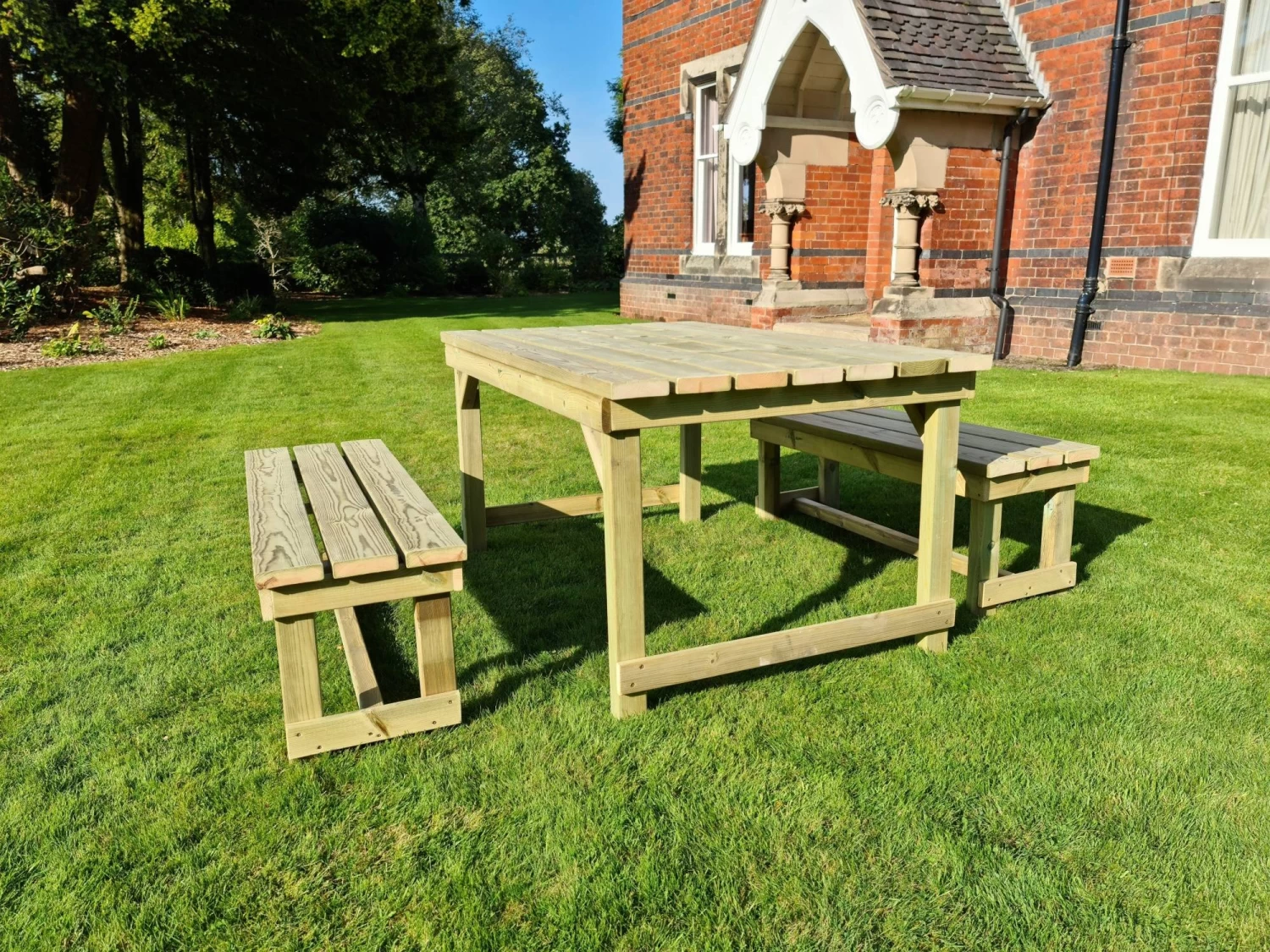 A strong and sturdy table set with rustic styling. The benches can be completely tucked under the table to reduce the footprint when not in use. Helping you make the most of your outdoor space.