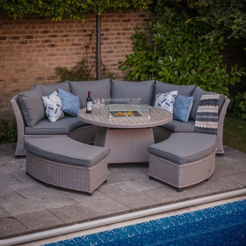 This showstopper of a piece will be the envy of your friends and neighbours. The set offers the perfect way to relax, eat, and entertain in style, with a stunning curved sofa, footstools and a round table with firepit. The sofas are deep and luxurious – the only problem is you won’t want to get back up after you’ve sat down!