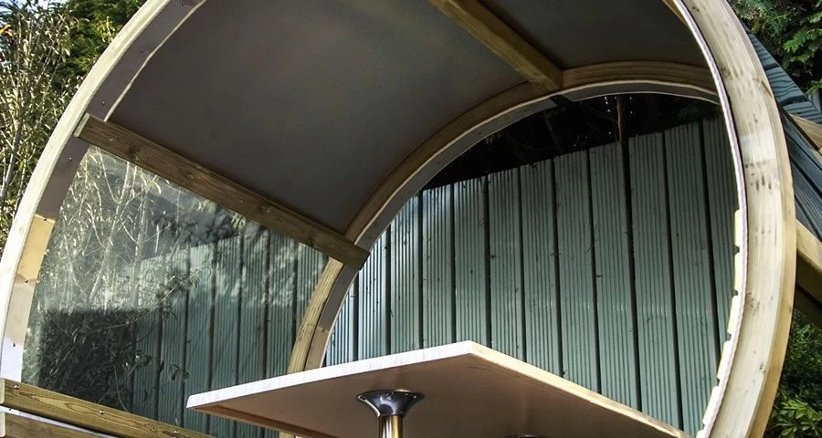 By mounting two pressure treated laminated timber circles opposite each other we have created a cylinder. An 800mm x 1200mm table was then fixed into the centre of the cylinder with two wooden seating sections either side. This leaves you with ample room for six people to be seated within. We have assembled this cylinder Wheel Bench using our signature parts of stainless steel, polycarbonate and timber.